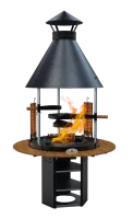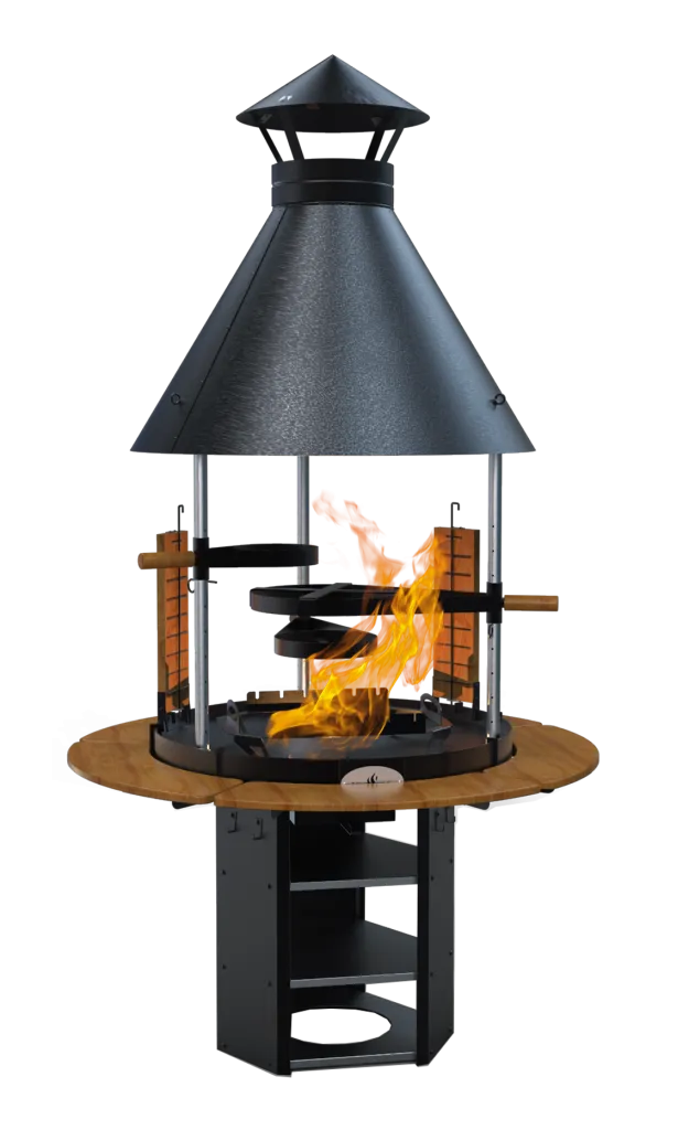 Стальная конструкция покрыта защитным слоем огнеупорной краски. Круглый очаг закрыт от непогоды цилиндрическим куполом с дымоходом. На стойках из нержавеющей стали закреплены регулируемые подставки, положение которых можно выбирать. Шашлычный модуль легко устанавливать и снимать. В комплекте предусмотрена ольховая доска для копчения. На нижних полках размещают дрова или мешки с углем. Инструменты, закуски и бокалы можно расположить на подвесных столиках создающих единую столешницу вокруг очага. Для чистки очага предусмотрен выдвижной зольник.